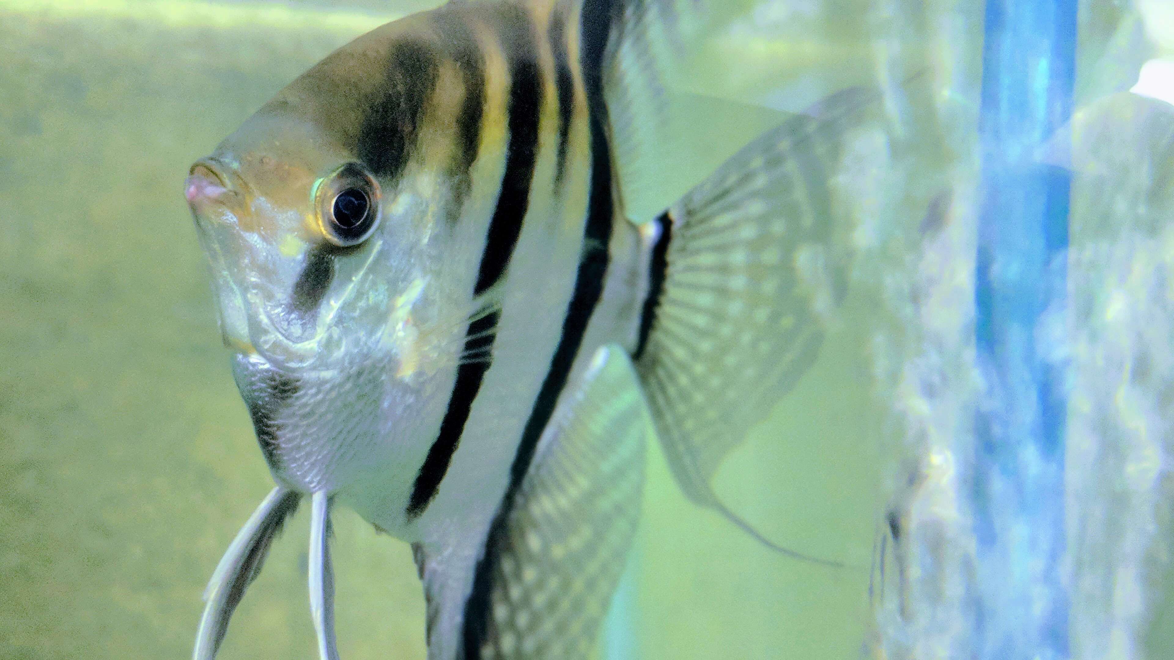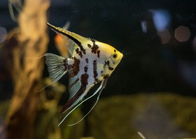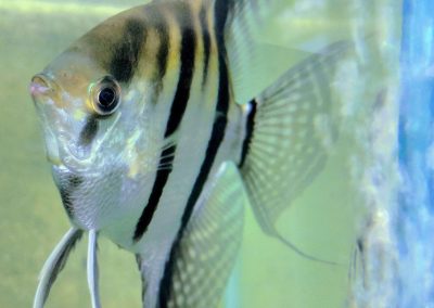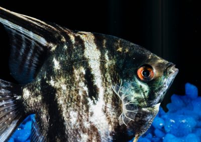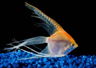 Angelfish sizes range from regular (about the size of a nickel) to extra large (about 3″+ body size).
